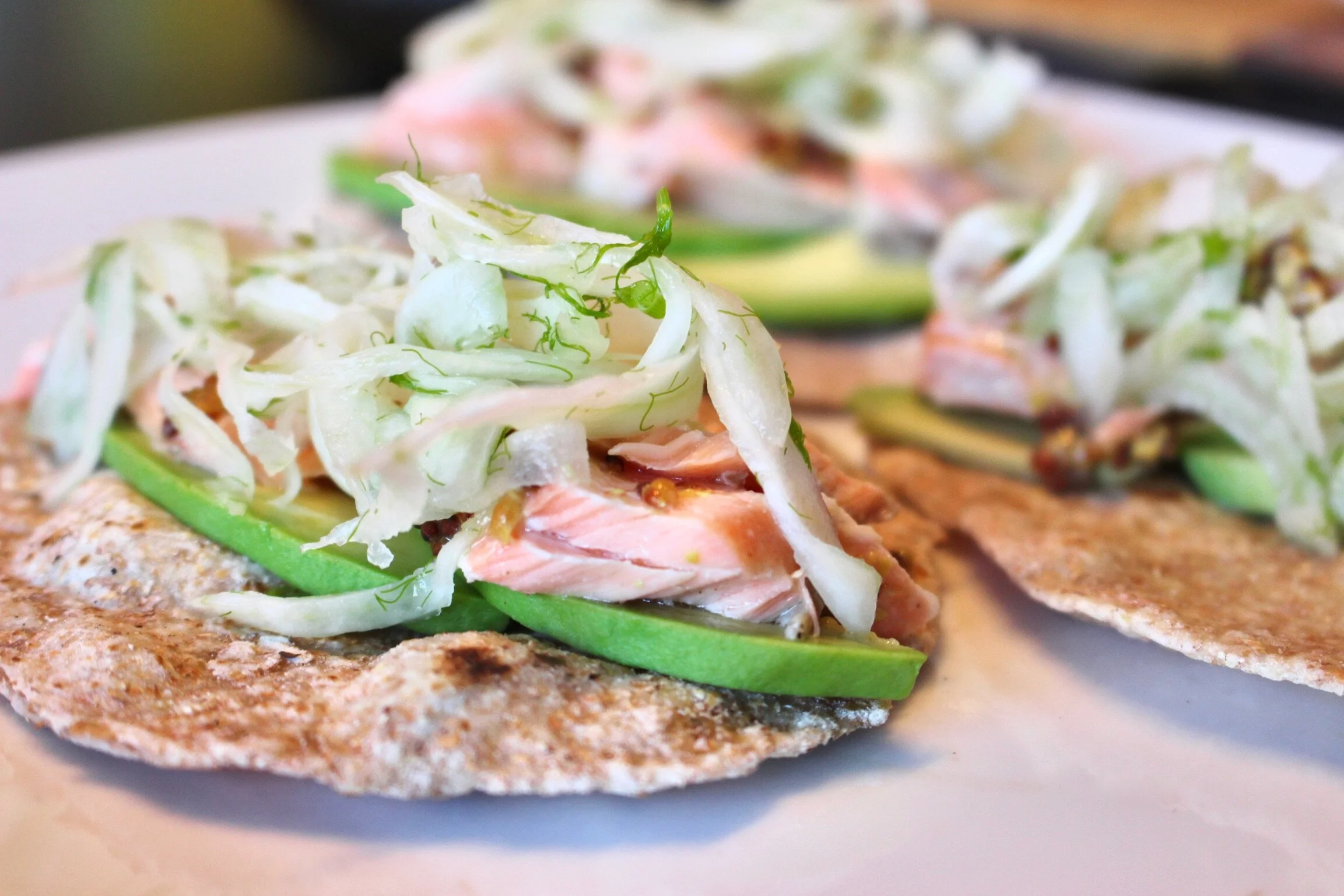 With the recent hot weather, I wanted something fresh, healthy and tasty for dinner. In my vegetable box delivery I had received 2 bulbs of fennel and treating it like cabbage in a slaw, it was the perfect companion to the lone salmon fillet I needed to use up. Fennel can be an acquired taste, but when you salt it and dress it in lime juice it takes the aniseed bite down a notch. This whole meal literally took 20 minutes, I seasoned the salmon and spread a layer of wholegrain mustard on top to form a crust in the oven. Serve with simple yoghurt flatbreads, fresh slices of avocado and the flaked salmon. A scattering of diced jalapeños brings it all together, really happy with this one!